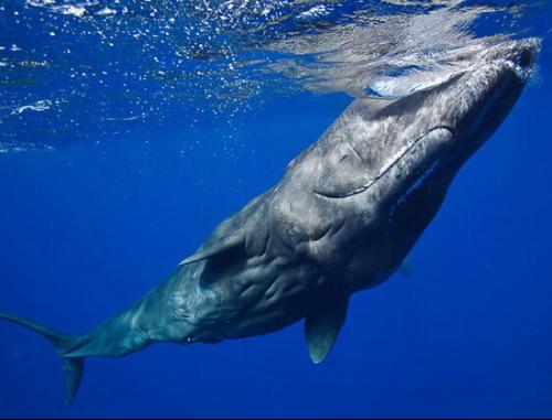 抹香鲸头重尾轻,宛如一头巨大的蝌蚪,头部占去全身的三分之一,看上去像个大箱子。鼻孔也很特殊,只有左鼻孔畅通,且位于左前上方,右鼻孔堵塞。所以,它呼气时喷出的雾柱是以四十五度角向左前方喷出的。