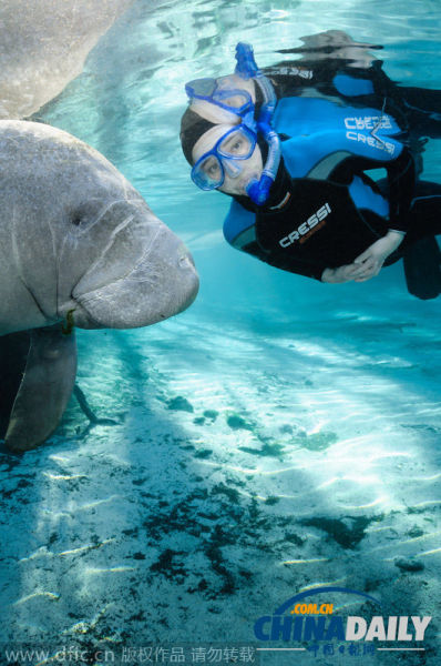 中国日报网9月25日电(欧叶)据当地时间25日报道,梅雷迪思和科拉贝尔赫姆在美国佛罗里达水晶河野生动物保护区潜水时遇到了一群海牛,海牛面对镜头一点也不羞涩,反而很积极,还忍不住追着美女,趁机献吻。