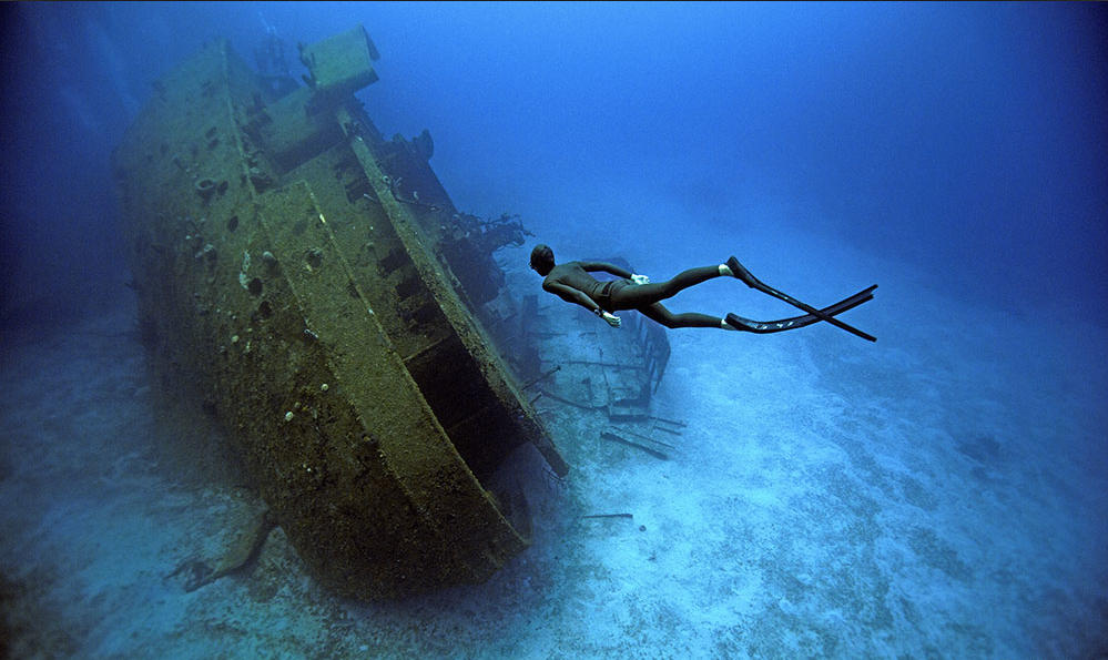 自由潜水中偶尔会有惊喜的事情发生,比如这次他们发现了一艘古老的船只。也许是某次事故之后,它沉没在此,在大海的怀抱里沉沉地睡去。