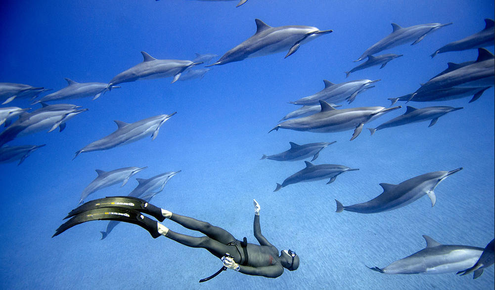在夏威夷附近的海域,他们则与飞旋海豚进行了一次亲密的约会,跟随在海豚群后自在畅游。