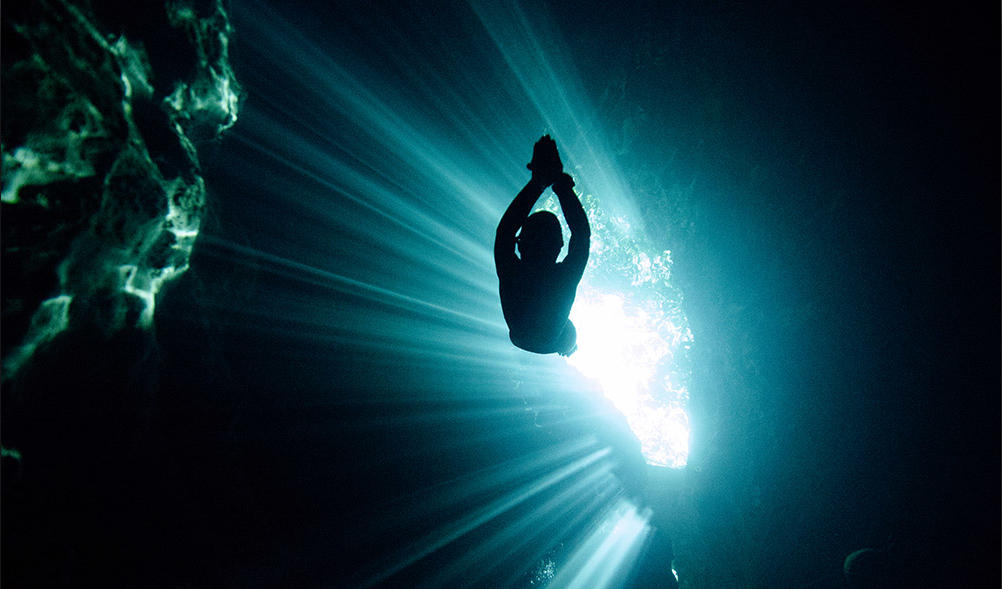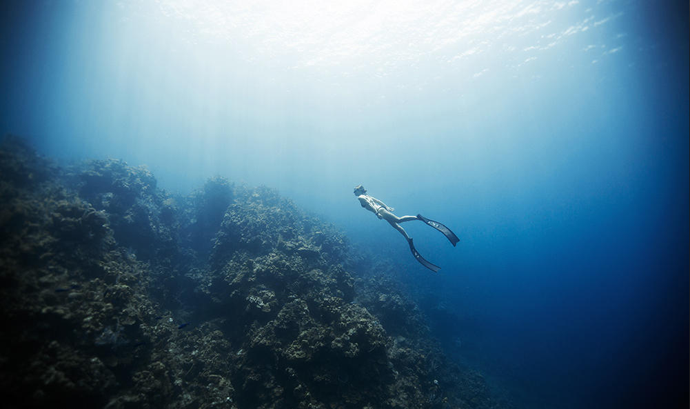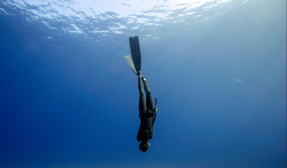 在训练课程中,克里斯蒂娜往海洋的更深处潜去。一望无际的大海中,人显得格外渺小。