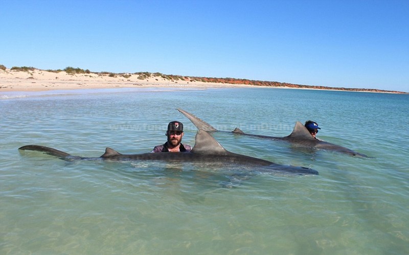 近日,澳大利亚埃斯佩兰斯两名渔民在西澳大利亚北部海岸为期4天的捕鱼行动中,成功捕获10头大型虎鲨,他们钓到鲨鱼后会和鲨鱼合照,再将鲨鱼放回大海。