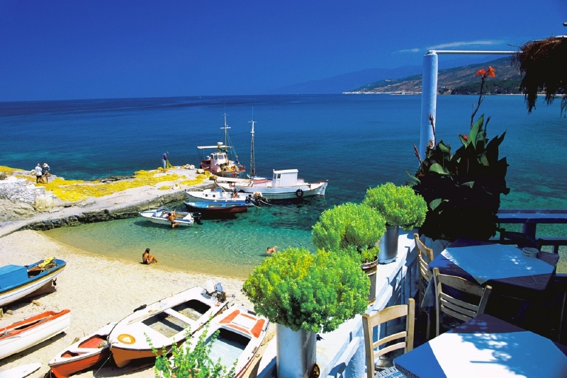 岛上人烟稀少,森林密布的峡谷、温泉和常有羊群出没的高地都为岛屿保留了一份粗犷而偏远的神秘感。这里有僻静的港湾、依偎着海岸的成排的渔村,但如想获得与这些截然不同的体验,那就应该上山探访令人称奇的Theoskepasti 礼拜堂。礼拜堂半掩于巨砾之下,阴冷的内部装饰着早已过世的僧侣的头骨。