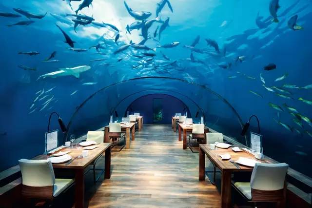 马尔代夫康莱德酒店的Ithaa餐厅位于海下5米,鱼群在玻璃穹顶上逡巡,珊瑚礁环绕,呼吸都是海水的咸淡味道