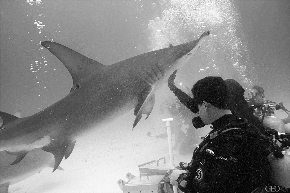 第二次潜水对我来说是最紧张的,当时水非常冷而且海面有浪,船上还有一条狗,每次扔一块鱼下去的时候,狗都在狂叫,鲨鱼在争抢的时候还把浪花激起来了。我当时没有穿潜水服,只穿了游泳衣浮潜,有一刻觉得有东西碰到了脚上,心一下子揪紧了,但后来发现只是水草。那一次,我一边潜水一边在麻木地按相机快门,大脑其实是一片空白。