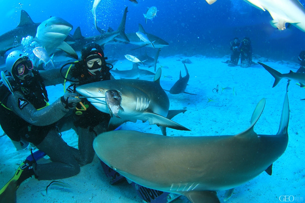 在那我前后一共进行了三次饲喂鲨鱼的潜水。第一次坐船到潜水点,我因为晕船还吐了,同船的人警告我说这样有可能会引来鲨鱼的围攻,所以我的情绪一下子就紧张起来了。刚下水我还不太敢喂鲨鱼,就是在一旁围观,带我去的人告诉我注意不要过快地移动身体,以免引起鲨鱼的不安,所以我在刚开始的时候几乎是一动不动地悬浮在那里。到后面我也跟着教练一起喂鲨鱼,我用叉子将箱子里面的鱼叉出来伸出去,就有鲨鱼缓缓游过来扯叉子上的鱼,当时我可以明显感觉到鲨鱼撕扯食物时的力度,需要很用力才能把叉子攥在手里。在那样一种情况下,虽然理智上知道他们是不会攻击我的,但那种仍然会觉得非常害怕。