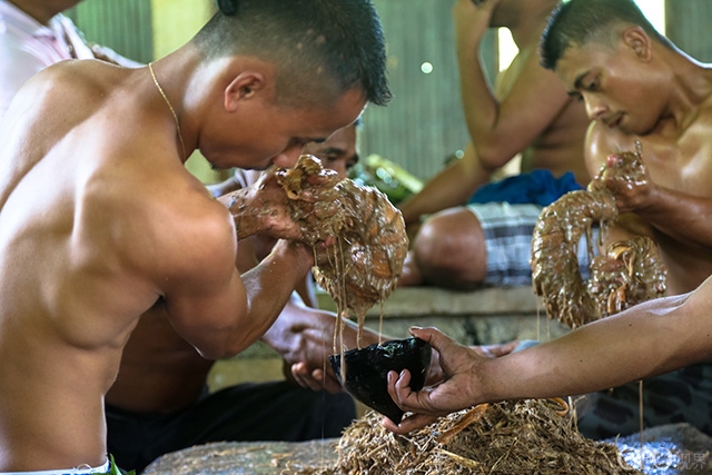 在太平洋岛国文化中有一种特别的植物,这里人称为Sakau,Sakau的根制成的饮料有镇静和麻醉的效果,当地人特别喜爱,路边经常见到有卖。但Sakau饮料的制作只能在一些特别的礼仪性场合中完成。我在最后一天自驾环岛的路上,正好碰到一个村庄集会庆祝面包果丰收而制作Sakau,有幸得以目睹全过程。青壮年男性村民负责制作,首先用石头敲击Sakau的根,让汁液渗出来,然后用棕榈树叶抹上清水,用Sakau根不断涂抹,最后用力揉拧棕榈树叶将混有Sakau的水不断挤出,就制成了饮料。集会上前几碗Sakau要先让长老们饮用,然后给了我这个突然闯入的宾客,最后就是全体村民轮流上前饮用。这样产生出来的Sakau,因为没有过滤,挤出来的其实和了很多树泥,喝起来也确实和泥巴的口感类似,不过作用神经的效果非常显著,刚喝完一口就能感觉身体的放松,眼前发亮。因为还要开车,也没敢多喝。