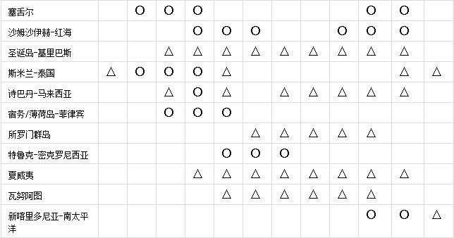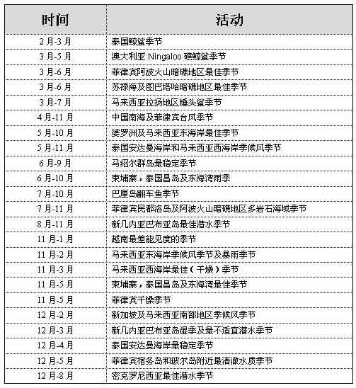下图是东南亚地区按照季节推荐的主题潜水活动。比如你想看mola mola翻车鱼,表中显示7-10月是巴厘岛看翻车鱼的季节。