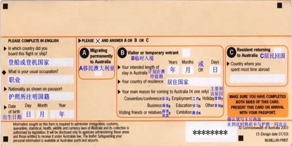 入境卡正面: