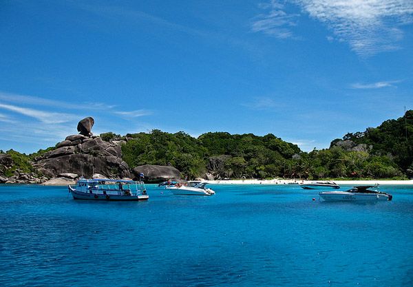 在这里,大片的坚固的珊瑚礁高度逐渐地降低到大概30-40米,由于海水深度的增加,这个位置被沙子所代替了。在这些岛屿周围形成的旋涡状的、营养丰富的水域有着大量色彩艳丽的热带鱼。 在这些水域观赏到巨大鱼儿的机会是很少的,但是在这你也许会偶然碰到美洲豹鲨鱼,甚至鲸鱼。在斯米兰群岛有二十多处合格的潜水地方,在那里有许多是发展起来了,拥有自己的国际声誉。9号班古岛(KohBangru)上的圣诞角(Chrismas Point),是以系列蜿蜒迷人的海湾而得名,多彩成群的蓝鳍鲹,金枪鱼穿梭其中,潜水爱好者您不妨体验畅游其中的乐趣。8号斯米兰岛(KohSimilan)上的仙境礁(Fantasy Reef),是适合于勘探大量水下岩石形成的受欢迎的地点,同时在这也能碰到一些活的发光物体。8号斯米兰岛上的象头岩(Elephant Head)可能是这群岛屿中最著名的潜水地带,这里是由伸出海面到斯米兰岛西南角的、形状不规则的岩石而命名的。