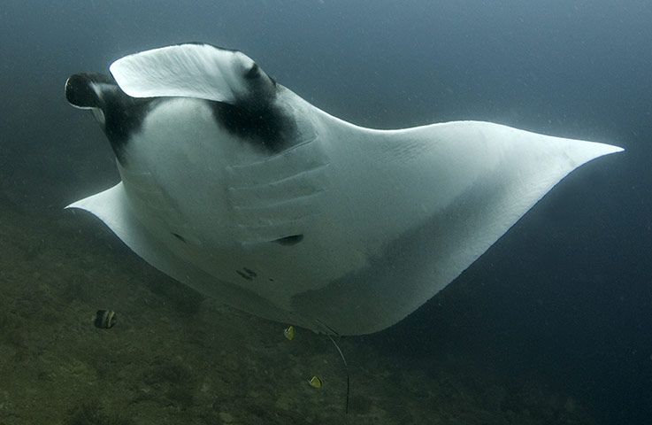 打招呼 通常蝠鲼都有一定的好奇心,为了吸引它,你对它做一些小的手势,甚至你呼吸时冒出水泡都会引起它的注意,让它为你放慢步伐。