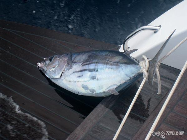 我终于看到了这条猎物,一条二十多磅的大眼金枪鱼。我们终于可以吃到新鲜的生鱼片了,真是太棒了。这是我的猎物,我把它绑在艇上,慢慢地欣赏它,这只来自海底的朋友,我不想伤害它,却拒绝不了它的美味,我收起了钩具,虽然我知道金枪鱼是成群的,但我不能太贪心了。当鱼的运气一但拥有了,就一发不可收拾了;