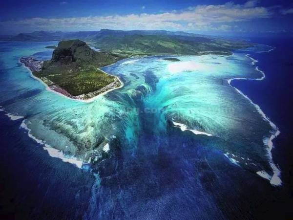 "水下瀑布奇观"位于毛里求斯西南端的岛屿,从高空中看去,湛蓝透明的海水之下竟然有一个银白色的"瀑布"!这个"瀑布"似乎就"沉浸"在海岛的悬崖边上。大量银白色的"水"顺着悬崖边直冲而下,很快就没入黑漆漆的海地深渊……