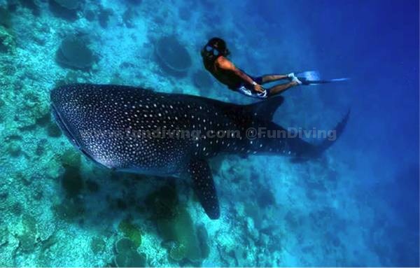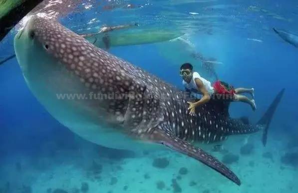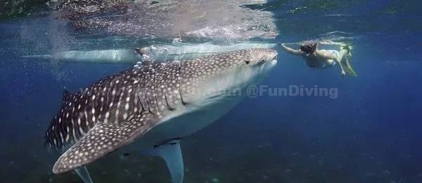 再说个更近的。上面说了那么多水下奇观,不是要深潜就是要飞到空中看全景,如果只会浮潜甚至不会游泳怎么办?那么,在海中与鲸鲨一同游泳,你敢挑战吗?