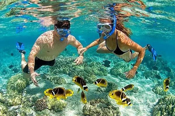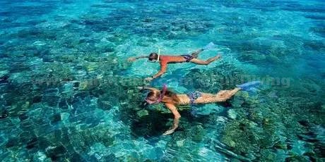 浮潜装备一般都是免费租借的。柔美的蓝天,五彩斑斓的沙子、礁石、珊瑚,在阳光的折射下,海水变得五颜六色。在海里,和你一起游的除了鱼还有只在电视上才看到过的十字海星、小海马、虎皮斑纹贝。也许你会以为是掉进了水族馆里,但这些都真实地呈现在眼前。